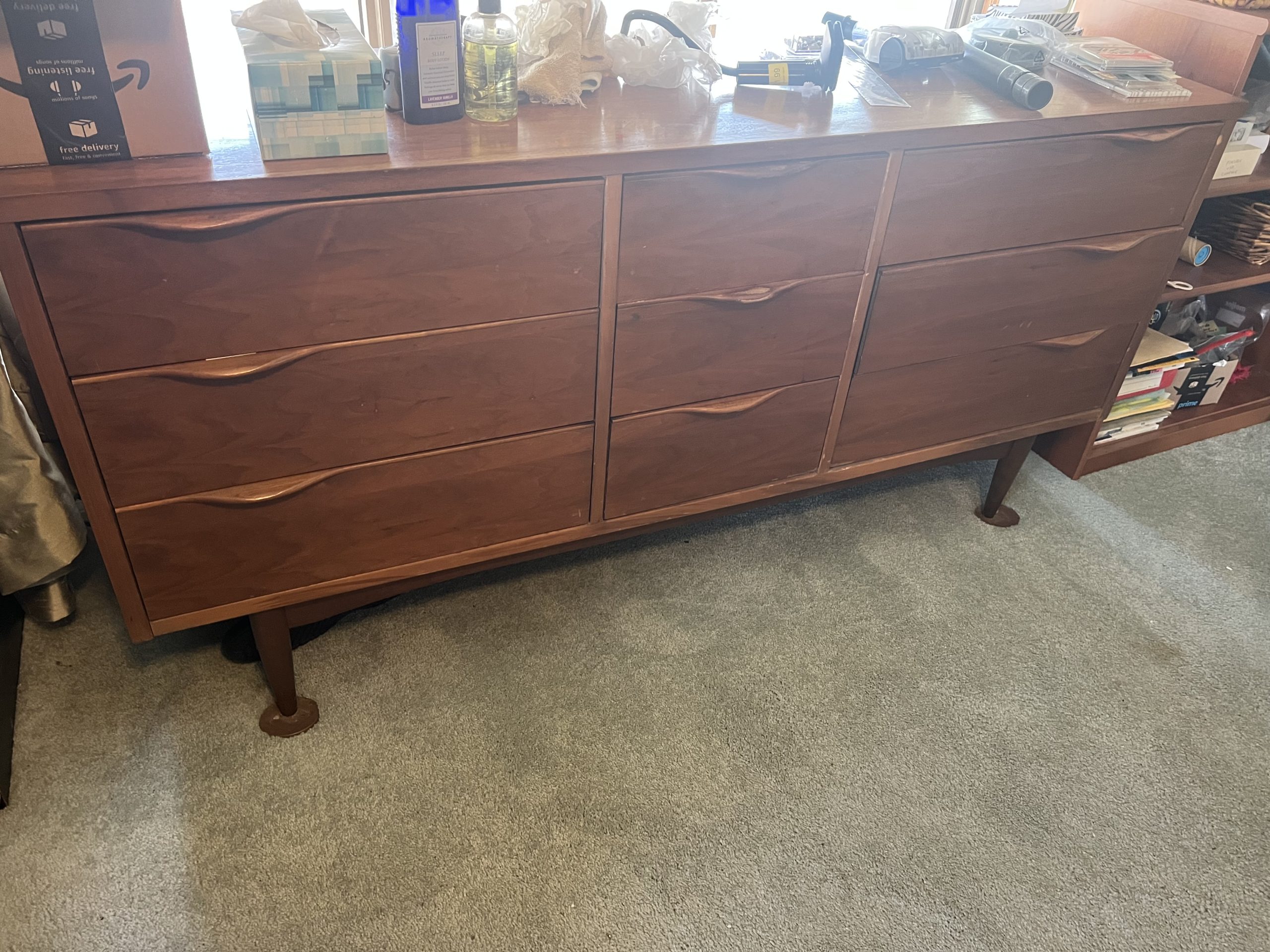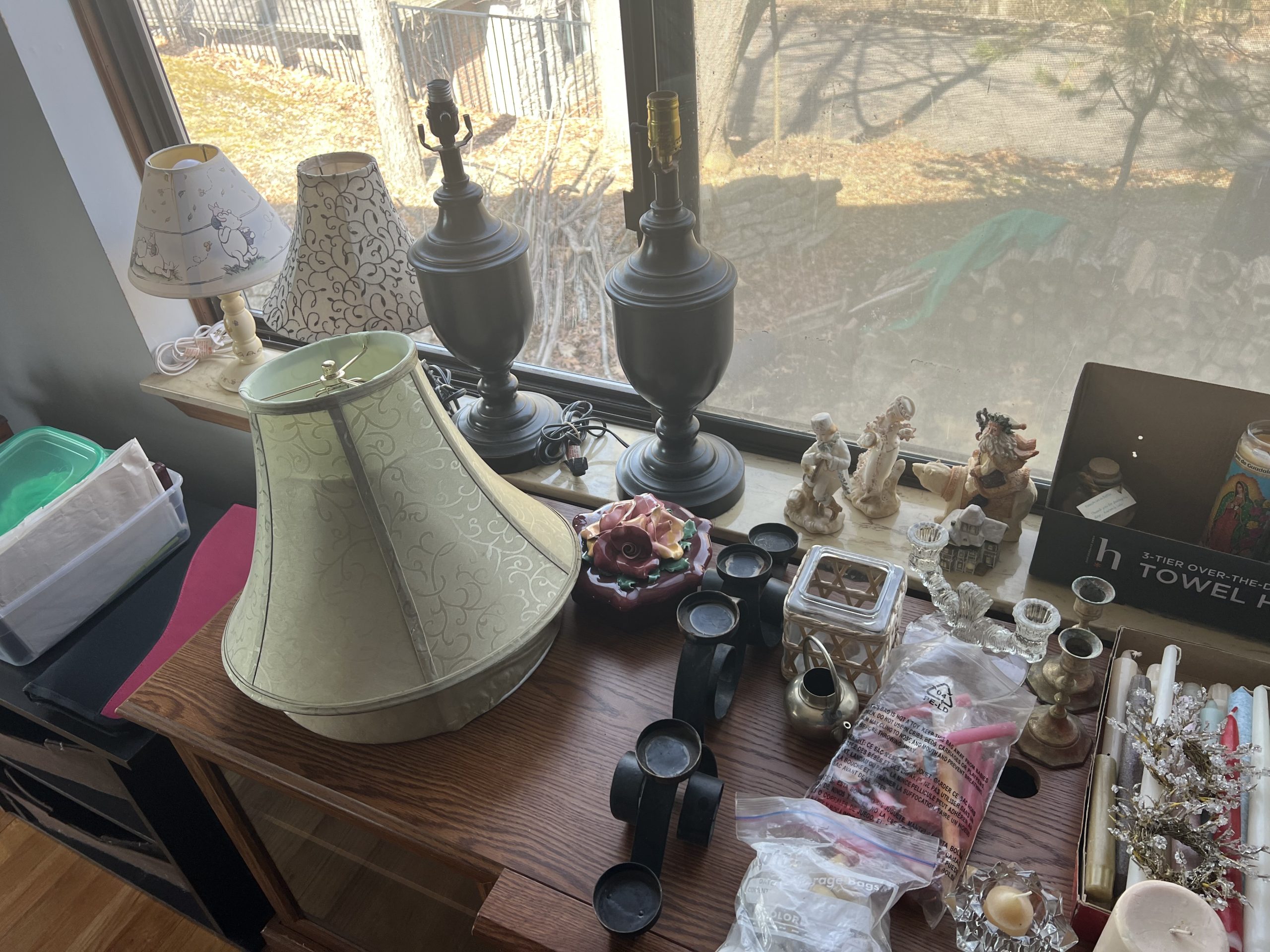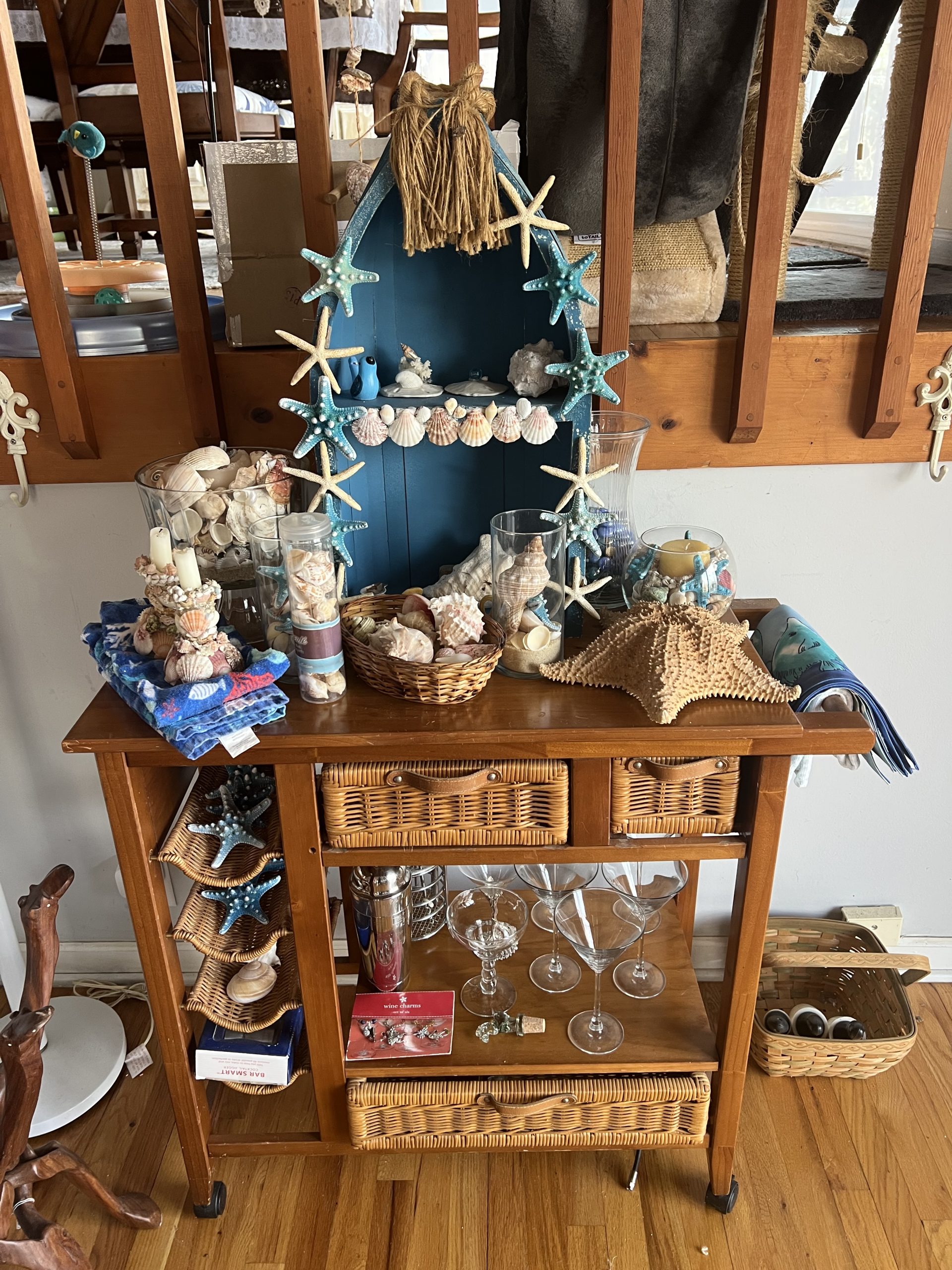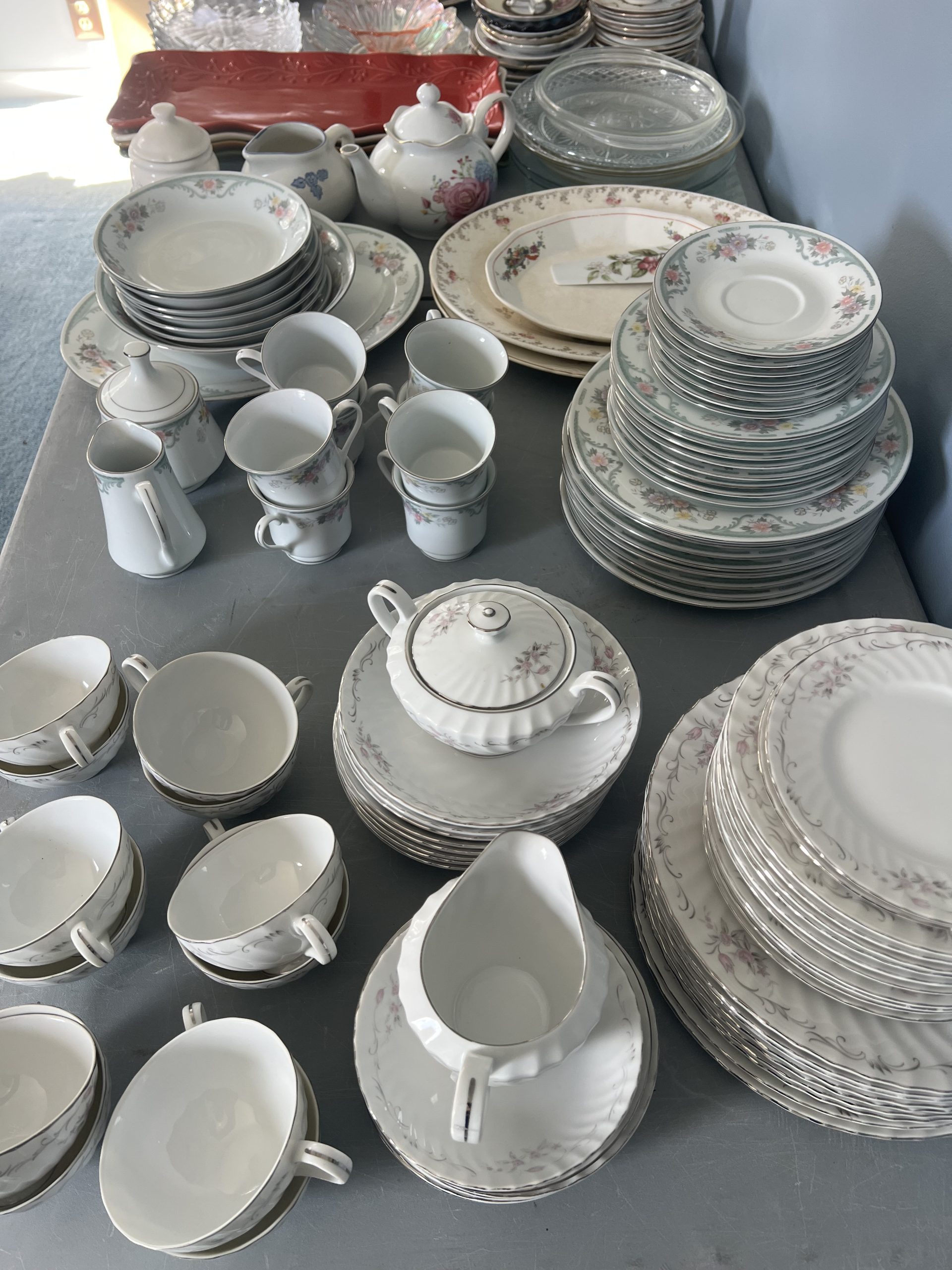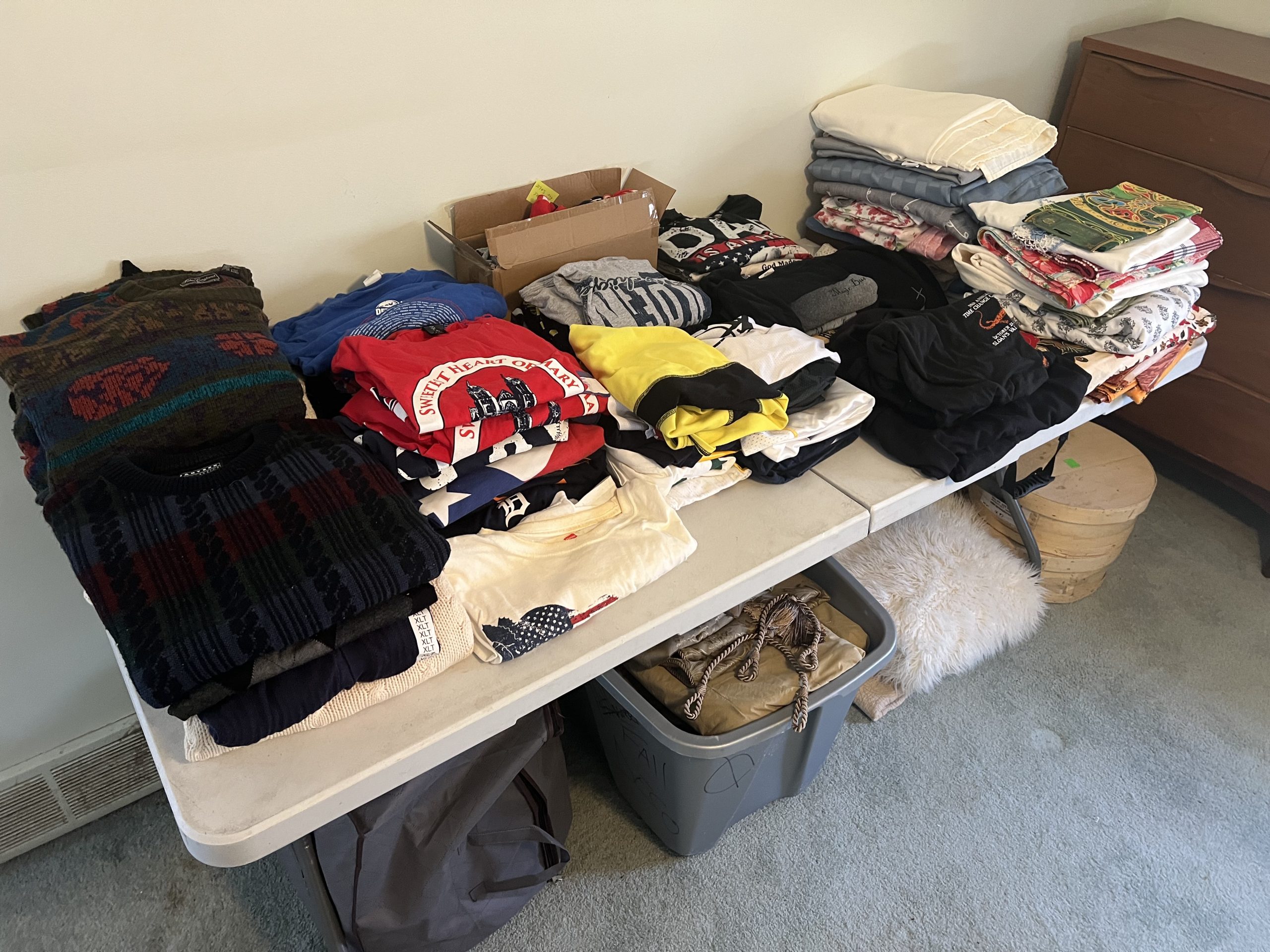Upholstered sofas, office furniture, vintage men’s t-shirts/clothing, ladies clothing/shoes, Harmony House mid century dressers, nautical decor, Gorman’s Furniture dining room set, French cottage shabby chic china cabinet, Norman Rockwell collectible train set, luggage, fine china, kitchenware, housewares, decor, costume jewelry, TV stand, vintage library cart, books, candles, bar stools, cat stand & more!